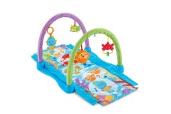 Ponořte se do zábavné hry s touto hudební dečkou Fisher-Price s motivem pláže a hrazdičkami plnými aktivit. Vaše miminko si může hrát na zádíčkách, kopat, plácat a snažit se dosáhnout na houpající se hračky nad hlavou včetně rybky, která svítí a přehrává melodie. Pasení koníčků bude rázem lehčí, když přemístíte hračky na podložku! Jak vaše malé roste, podložka se jednoduše změní na tunel, kterým může radostně prolézat! Plazení se rázem stane podmořským dobrodružstvím za doprovodu svítící rybky, která přehrává zvuky aktivované pohybem, zatímco se váš malý červík snaží provrtat skrz. Podložku lze jednoduše a rychle prát v pračce!