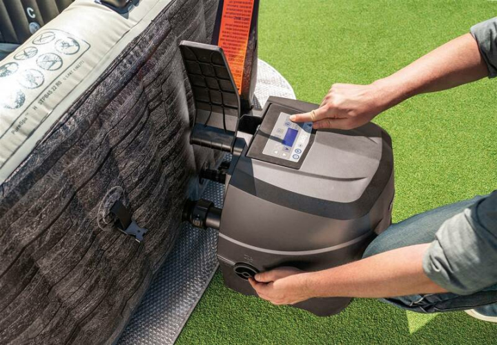 Integrovaný QuickFill Inflation System usnadňuje nastavení, zatímco systém slané vody zajišťuje jednoduchou údržbu. Ochranný kryt a filtrační čerpadlo s výkonem 1,741 l/h udržují vodu čistou.